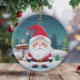 Santa, North Pole, St Nicholas, Kris Kringle, Father Xmas Ceramic Ornament with customizable name on his hat and featuring a North Pole white Christmas scene of winter wonderland snowy trees in the background. Unique cartoon whimsical character illustration graphic with wintry white snow landscape.