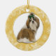 Une bordure dorée avec des flocons de neige blancs ornés fait un joli cadre pour une image d'un petit chien chiite brun et blanc sur le devant de cet ornement. Le chien porte un arc vert brillant. Le dos a le même cadre de flocon de neige avec un intérieur pâle qui tient votre texte personnalisé.