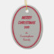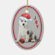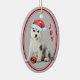 Sur le devant de cet ornement de Noël se trouve l'image d'un adorable chiot sibérien Husky portant un chapeau de Père Noël rouge et blanc. Le chiot a trouvé une ampoule Holiday qui ressemble à une ceinture du Père Noël et est prêt à jouer. A côté de lui se trouve le texte en rouge "JOY". L'image est placée sur un arrière - plan gris argenté avec un cadre ovale à double doublure rouge. Le dos de l'ornement a le même cadre de bordure avec votre texte personnalisé contenu dans plusieurs champs.