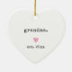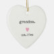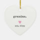 Célébrez un moment spécial avec ce ornement minimaliste en forme de coeur, parfait pour de nouveaux grands-mères ! Doté d'un design propre et moderne avec le mot "grand-mère", un coeur rose doux, et l'année "est. 2024," cet ornement en céramique est un beau gardien pour marquer cette étape passionnante. Personnalisez-le avec n'importe quelle année pour commémorer l'arrivée d'un nouveau petit-enfant. Son style simple et élégant en fait un complément intemporel à la décoration de vacances ou un cadeau de coeur pour la nouvelle grand-mère dans votre vie.