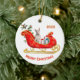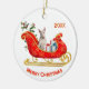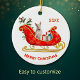 Un beau chien blanc Bull Terrier est assis parmi des paquets cadeaux emballés dans un traîneau de Noël rouge et or orné. En haut se trouve un champ de texte qui peut être customisé pour votre nom ou l'année en cours. En bas se trouve un autre champ de texte personnalisé qui dit "Joyeux Noël". Les deux côtés de l'ornement ont la même image.