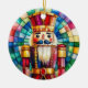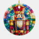 Inspired by the iconic ballet and traditional holiday decor, the design features a handsome Nutcracker in brilliant shades of red, gold, and blue, framed by a vibrant, mosaic-style background. The glossy, round ceramic material beautifully highlights the watercolor art, making it look like a piece of genuine stained glass.