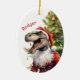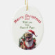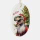Voici un magnifique ornement amusant pour ce fils spécial, neveu, ou petit-fils qui aime les dinosaures. L'avant présente l'image d'un dinosaure T-Rex à l'allure féroce habillé de son casquette d'hiver et de son costume Père Noël. Il se tient devant un sapin de Noël décoré. Le nom de votre enfant est en rouge en haut à gauche. Le dos de l'ornement a une autre image du dino portant un paquet de cadeaux, et a plusieurs champs de texte pour vous de customiser. Faites-le dire ce que vous voulez !