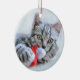 Ornement avec une mignonne photo de Noël d'un chat tabby gris mordant joyeusement un chapeau santa rouge. Ses gros pattes moelleuses rendent cette photo très agréable.