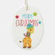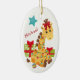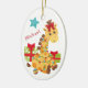 A l'avant de cet ornement de gardien pour enfant se trouve une adorable girafe enveloppée d'une série de lumières de Noël. A côté de lui sont emballés des paquets de vacances. Le nom de votre enfant est en rouge juste en dessous d'une étoile bleue. Le dos a une autre image de la girafe avec un message de Noël joyeux et plus d'étoiles. Mignonne !