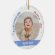 Tendance, élégant et mignon ornement personnalisé de Noël pour les garçons jumeaux avec un cadre blanc avec des flocons de neige et des étoiles qui a une ouverture ronde pour une photo horizontale personnalisée, et bande bleue incurvée de chaque côté sur lequel apparaît le nom ou les noms des jumeaux dans une police de script / typographie élégante. Ce design inclut sur le devant les mots "Notre premier joyeux petit Noël 202X"