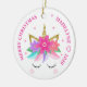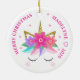 Ce ornement de Noël à la licorne personnalisée présente un joli visage de licorne avec des fleurs roses, une crinière arc-en-ciel et des étoiles de parties scintillant en faux or. Personnalisez-le avec votre texte à l'avant et à l'arrière.