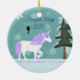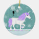Unicorne mauve et blanche et une fée silhouette traversant une forêt remplie de flocons de neige. Ils répandent leur magie de vacances. Personnalisez avec un nom et une année.