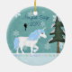 ~Jolie licorne bleue et blanche et ornement fée de Noël des fêtes de Noël. Ils traversent une forêt d'hiver magique avec des flocons de neige qui tombent. Personnalisez avec un nom et une année. Quelques graphiques par artwork©delightful-doodles.com