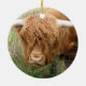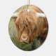 Comporte une photo d'une jolie vache des montagnes rouge mignonne sacrée (kyloe), collant sa tête par une barrière pour frôler sur l'herbe. Cette photo a été rentrée les montagnes de l'Ecosse.