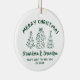 Featuring a whimsical festive design it’s a timeless memento that captures one of life’s most precious moments. Each elegant round ceramic ornament includes a gold hanging string and is available in six festive colors — Black, Green, Blue, Red, Pink, and Sage Green.