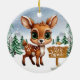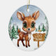Winter wonderland wildlife deer holiday decor ceramic ornament! Featuring a cute baby doe in front of a snowy forest, complete with snowflakes falling gently. A sign reads "Let It Snow." The vibrant, wintry cartoon graphic illustration scene captures the cozy joy of the season, with evergreen forest. This two-sided decoration hangs beautifully on your Christmas tree, wreath, or as a festive gift. Perfect for whimsical fawn animal lovers, or anyone dreaming of a white Xmas—customize to make it uniquely yours!