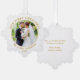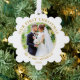 Moderne Notre première photo Couple de Noël Carte d'ornement de vacances - Arrière - plan blanc avec texte or. C'est une carte de voeux qui est aussi un ornement.