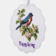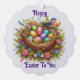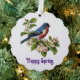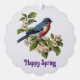 Une belle photo d'un oiseau sur une branche aux fleurs roses est présentée sur cette carte ornementale pour le printemps et Pâques. L'un des côtés a le message "Printemps heureux". L'autre côté a une photo d'un oiseau et des fleurs et un nid rempli d'oeufs colorés avec le message "Joyeux Pâques pour vous", Une belle carte de voeux ornementale pour envoyer famille et amis pour Pâques !