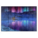 Les aurores boréales brillent au-dessus d'un paysage hivernal enneigé. Des arbres roses, violets, bleus et verts illuminent les champs enneigés et se reflètent depuis un lac gelé. Au bord de l'eau se trouve un chalet avec une lumière chaude qui s'écoule de ses fenêtres et de la fumée venant de la cheminée - un refuge confortable du froid étincelant.