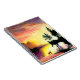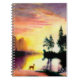 Peinture d'un cerf par un lac dans la forêt au lever du soleil.