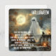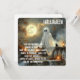 Deuil - Où les fantômes gardent des secrets Carte d'Halloween Un personnage fantomatique drapé en blanc s'assoit solennellement sur une terrasse en pierre, ses yeux creux fixés sur la lune brillante au-dessus. Un chat noir se perche à proximité, silencieux et vigilant, comme s'il gardait quelque chose oublié depuis longtemps. Des bougies scintillent à ses pieds, projetant une lumière douce à travers la pierre parsemée de cailloux. Les chauves-souris tourbillonnent à travers la brume, et des feuilles d'automne éparpillées s'accrochent à la scène comme des restes d'un conte disparu. La composition hums avec la tranquillité spectrale et le folklore maudit - où chaque ombre se sent comme un souvenir, et chaque chuchotement peut être un avertissement.
