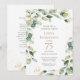 Cette invitation de fête surprise pour les 75 ans avec carte, ornée d'eucalyptus aquarelle exquise, de feuilles d'or et de points dorés éclaboussés, est parfaite pour célébrer votre épouse, maman, sœur, tante, amie, grand-mère. Son design fluide et doux est à la fois moderne et traditionnel. Sélectionnez Personnaliser ce modèle pour le rendre unique. En quelques secondes, vous verrez vos invitations pour la fête des 75 ans.
