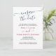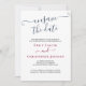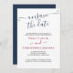 Simple et élégant Désenregistrez la date, la carte de mise à jour Mariage pour avertir les invités de votre report mariage. Le design est en bleu marine, bordeaux et blanc avec des lettrages élégants et des polices serif élégantes. Le libellé de l'exemple se lit comme suit : "Nous sommes désolés d'annoncer qu'en raison d'événements récents, le mariage de [vos noms] a été reporté. Nous vous le ferons savoir dès que nous aurons fixé une nouvelle date. C'était une décision difficile et nous vous remercions de votre compréhension". Le modèle est configuré pour que vous puissiez ajouter vos noms et modifier autant de comptes de report que vous le souhaitez.