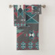 Serviette de bain Motif Native Southwestern Triangle Ensemble de 3 accessoires de salle de bain par TheFabricSeal à Zazzle. Le style artistique du sud-ouest de l'Inde a influencé la conception de motifs sur couvertures, tapis et tapis. Cette ligne géométrique design est élégante avec des formes croisées de pointes de flèche, de diamants et de pyramides remplis de couleurs palette de tons turquoise, noir, blanc, gris fusain foncé, bleu ciel clair, vert forêt, vert kaki et rouge indien.