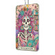 Design coloré et dynamique avec une carte tarot amusante avec un squelette féminin. Le squelette a des cheveux roses sauvages avec des fleurs dedans, un crâne de sucre, et tient un livre ouvert. Le texte coloré dit : "Le ver de bibliothèque". Ce design est disponible sur une grande variété de produits.