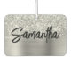 Customisez le style et la taille de la police selon vos besoins. Il y a plusieurs polices de calligraphie de script de brosse audacieuses, modernes et disponibles. L'arrière - plan présente une grande parties scintillant en faux argent et un art numérique en faux métal gris argenté en faux métal. Le glamour en parties scintillant girly imprime comme une photo sur ce rafraîchissement décoratif de voiture air.