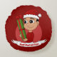 Coussin rond avec l'illustration d'un joli petit garçon souriant heureux, il porte le costume de Père Noël rouge et blanc et tient un cadeau; avec modèle texte modifiable pour votre nom ou message, Noël design avec un arrière - plan rouge