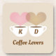 Un dessous de verre de boisson personnalisé pour "les amateurs de café". Comprend deux tasses à café avec une vapeur en forme de coeur brun et rose clair entrelacée et un arrière - plan couleur crème. Personnalisez le texte personnalisé avec les initiales du prénom du couple.