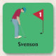 golfeur personnalisé vert carré, portant un casquette, chemise rouge profonde et pantalon bleu, mettant une balle de golf dans un dessous de verre en plastique trou.