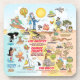 Une scène lumineuse et colorée offre une vue spectaculaire de la Californie du Sud - personnages farfelus sur la plage et le désert de SoCal présentant les parcs de Los Angeles, Orange County, San Diego, Père Noël Barbara, Riverside, Palm Springs, El Centro, Salton Sea, Anza Borrego et Joshua Tree ainsi que les villes frontalières de Tijuana, Tecate et Mexicali. Cette scène de charme a tout - un surfeur pend dix tandis qu'un orque saute de l'eau, des animaux de zoo sourient pour la caméra, les amateurs de vin font un toast comme un randonneur est remarqué par un OVNI et bien plus encore...