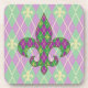 Un motif arlequin de vert et de violet se transforme en Jacquard ludique avec une superposition de silhouettes de diamants dorés et de fleur de lis, créant un motif amusant et coloré parfait pour toute célébration Mardi Gras influencée par la Nouvelle-Orléans. La motif est masquée derrière la silhouette d'une fleur de lis pour ajouter une note finale amusante.