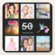 Un dessous de verre de fête pour une fête de 50e anniversaire, célébrant sa vie avec un collage de 8 de vos photos. Modèles pour un nom, 50 ans et une date. Date de naissance ou date de la fête. Lettres blanches et grises. Arrière - plan noir élégant.