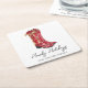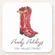 Ces dessous de verre ont un portrait aquarelle d'une paire de bottes de cowgirl rouges avec la légende "vacances pleines".