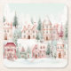 Une aquarelle rose et menthe Décor hivernal avec des maisons douillettes, des arbres de Noël et de la neige!