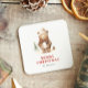 Ces dessous de verre de fête de vacances rustiques et confortables présentent une aquarelle illustrant un ours brun mignon vêtu de vêtements d'hiver. Les mots "MERRY CHRISTMAS" apparaissent en lettres rouges serif qui se coordonnent avec l'art. Ajoutez le nom de votre famille en italique gris-fusain.
