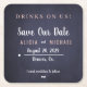 Simple rustique décontracté Boissons sur nous! blanc et rose vif script de typographie, nom, date, et placer mariage personnalisé enregistrer le dessous de verre de la date sur un arrière - plan bleu marine de minuit sombre.
