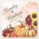 Sous-verre en papier carré pour mariage d'automne aux thèmes de citrouille, feuilles d'automne et tournesol. Le design présente un fond à thème automnal avec des tournesols, des feuilles d'automne, une citrouille et un espace pour ajouter les noms du couple et la date du mariage. Ce sous-verre en papier mignon peut être facilement personnalisé en changeant les noms et la date.