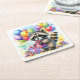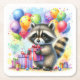 Raton laveur doux tenant un cadeau d'anniversaire entouré de ballons d'anniversaire en bleu, jaune, vert, violet et rose. Ces dessous de verre en papier sont mignons pour une fête d'anniversaire à thème Woodland ou pour tout enfant qui aime les ratons laveurs !