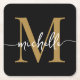 Girly Elegant Moderne Noir et Or Monogramme Nom initial Signature Script Personnalisé Carré Dessous de verre de papier personnalisé. Ce design avec votre prénom dans une jolie typographie de police de queue d'essuie-glace (ou calligraphie) à la main avec un monogramme initial en or et blanc sur noir. Facile à customiser. Grand cadeau de ménage féminin élégant, aussi pour l’anniversaire, la journée de la mère, mariage, douche nuptiale, fête de 16 ans, baby shower, pour la fête de remise des diplômes et C’est pour la fille qui aime les choses simples uniques minimalistes.
