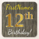 Ce dessous de verre en papier simple comporte un message comme "12e anniversaire de FirstName!", avec le "12e" ayant une apparence de couleur fausse/imitation or, sur un arrière - plan ayant un motif rustique faux bois. Le nom peut être customisé. Des dessous de verre de papier personnalisés comme ceux-ci pourraient peut-être être utilisés à une fête d'anniversaire pour quelqu'un qui célèbre son douzième anniversaire. [~Z0000198]