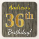 Ce simple dessous de verre en papier présente un message comme "36e anniversaire d’Andrew!", avec le "36e" qui a une apparence de couleur fausse/imitation or, sur un arrière - plan ayant un motif rustique en faux bois. Le nom peut être personnalisé. Des dessous de verre de papier personnalisés comme ceux-ci pourraient peut-être être utilisés à une fête d'anniversaire pour quelqu'un qui célèbre son trente-sixième anniversaire. [~Z0000198]