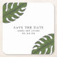 Tropical enregistrez les dessous de verre de date avec deux grands feuilles de palmiers illustrés à main verte, l'un dans le coin supérieur gauche et l'autre dans le coin inférieur droit, sur un arrière - plan blanc. Au milieu se trouvent les mots "Enregistrer la date" et vos noms et date. Ce design est parfait pour un mariage de destination estivale sur une plage tropicale.