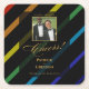 A favour guests will actually keep — this square coaster features "Cheers" in flowing gold calligraphy, a square-framed couple photo, the grooms' names and wedding date against the signature diagonal rainbow stripes on black. Use your engagement shoot, a favourite couple photo, or any image that tells your story. A stylish bar accessory for the cocktail hour, reception, or any celebration long after the wedding day.