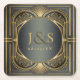 Ce dessous de verre élégant fait partie d'une suite mariage art déco sophistiquée, dotée de cadres luxueux et de détails dorés complexes et chatoyants. Les lignes classiques dégagent un charme vintage glamour, avec une palette de couleurs noir, or brillant et gris chaud. Les détails ornés ajoutent une touche de sophistication à ce design intemporel. Ajoutez vos initiales et votre date de mariage facilement en utilisant le modèle fourni. Recherchez ID1033 pour voir d'autres produits mariages dans le jeu de conceptions.