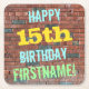 Ce dessous de verre amusant à thème d'anniversaire comporte un message comme "HAPPY 15th BIRTHDAY, FIRSTNAME!", où le nom peut être personnalisé. L'arrière - plan est représenté par un mur en brique composé de briques de couleur rougeâtre. Le texte du message personnalisable comporte des couleurs comme le bleu, le jaune et le vert, et il a un aspect inspiré de celui des graffitis peints. Des dessous de verre comme ceux-ci pourraient être utiles comme décorations pratiques à une fête d'anniversaire pour quelqu'un qui célèbre son quinzième anniversaire. [~Z0000288]