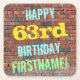 Ce dessous de verre amusant à thème d'anniversaire comporte un message comme "HAPPY 63rd BIRTHDAY, FIRSTNAME!", où le nom peut être personnalisé. L'arrière - plan est représenté par un mur en brique composé de briques de couleur rougeâtre. Le texte du message personnalisable comporte des couleurs comme le bleu, le jaune et le vert, et il a un aspect inspiré de celui des graffitis peints. Des dessous de verre comme celui-ci pourraient être utiles comme décorations pratiques à une fête d'anniversaire pour quelqu'un qui célèbre son soixante-troisième anniversaire. [~Z0000288]