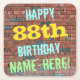 Ce dessous de verre amusant à thème d'anniversaire comporte un message comme "HAPPY 88th BIRTHDAY, NAME-HERE!", où le nom peut être personnalisé. L'arrière - plan est représenté par un mur en brique composé de briques de couleur rougeâtre. Le texte du message personnalisable comporte des couleurs comme le bleu, le jaune et le vert, et il a un aspect inspiré de celui des graffitis peints. Des dessous de verre comme ceux-ci pourraient être utiles comme décorations pratiques à une fête d'anniversaire pour quelqu'un qui célèbre son quatre-vingt-huitième anniversaire. [~Z0000288]
