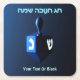 Un rêve moderniste, métallique, bleu contre un arrière - plan sombre et nocturne. Deux des lettres hébraïques trouvées sur un dreidel, une nonne et un shin, brillent brillamment. Le texte hébreu "Chag Chanukkah Sameach" (Hanoukka heureuse) apparaît également en bleu et blanc éclatant. (Carte de voeux avec design assorti également disponible) Ajoutez votre propre texte supplémentaire.