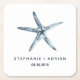 Personnalisez avec vos noms et date mariage ou texte personnalisé cet élégant dessous de verre de papier nautique aquarelle. Conçu pour correspondre à notre collection de mariages "Seahorse and starfish", ce dessous de verre côtier présente une merveilleuse illustration d'un Starfish en bleu marine. Idéal pour un cocktail-heure mariage, un dîner de fiançailles ou de répétition, une soirée de douche nuptiale, un brunch avec douche pour couple.