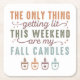 Ce design d'automne humoristique et cosy comprend la phrase spirituelle "La seule chose qui s'illumine ce week-end sont mes bougies d'automne" dans un mélange de polices audacieuses et élégantes. Le texte est aménagé de façon créative avec des tailles et des styles de police différents, ajoutant un intérêt visuel et un ton ludique. La palette de couleurs comprend des teintes chaudes d'automne comme l'orange brûlé, les verts terreux et les marron doux, qui évoquent la chaleur et le confort de la saison.